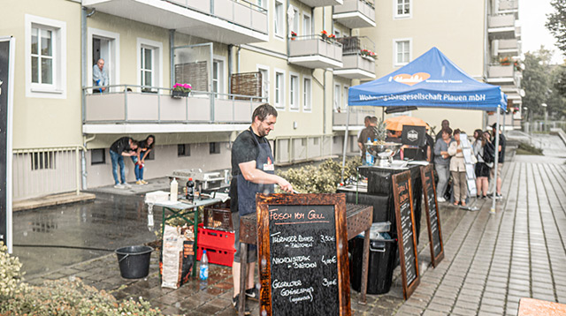 Nach gut 2-jähriger Corona-Zwangspause konnten wir am vergangenen Samstag endlich wieder ein Event für unsere Mieter auf die Beine stellen. Zu unserem besonderen Mieterfest „Musik unter Nachbarn“ im Innenhof unseres Wohnquartiers August-Bebel-Straße/Bahnhofstraße/Jößnitzer Straße/Forststraße fanden sich zahlreiche Mieter und Gäste von Jung bis Alt ein, um bei Roster oder Steak frisch vom Grill gemütlich beisammen zu sitzen. Ab 17 Uhr sorgte Matthias Nave vom Vogtland-Radio für Musik und gute Laune und entlockte dem ein oder anderen Gast so manche Anekdote und auch jede Menge Lob für die WbG als Vermieter.