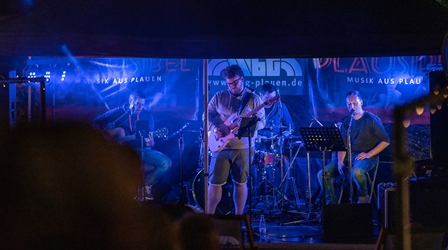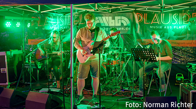 Nach einem kurzen Schauer und mit Einbruch der Dunkelheit übernahm schließlich die vogtländische Band PLAUSIBEL das Mikro und die Bühne. Die 4 Musiker um Lead-Sänger Patrick Schubert brachten eine bunte Mischung aus Rock und Pop zu Gehör und reisten dabei quer durch die Jahrzehnte. Ein kleines Intermezzo fürs Herz gab die Sängerin Kira. Mit ihrer hellen, glockenklaren Stimme verzauberte sie für rund 15 Minuten das Publikum, bevor Plausibel wieder übernahm und mit einigen Klassikern, die das Publikum zum Tanzen animierten, den Abend ausklingen ließ.