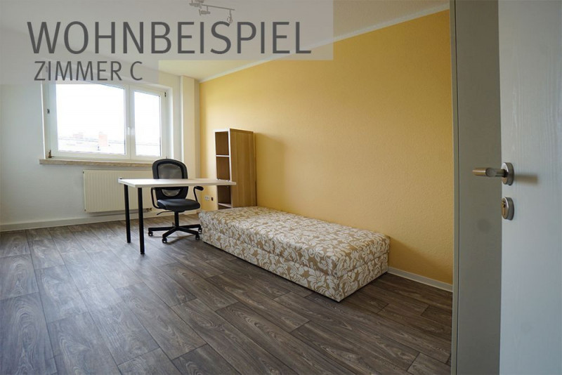 Das Zimmer ist teilweise möbliert – Bett, Schreibtisch und die wichtigsten Möbel sind bereits vorhanden.