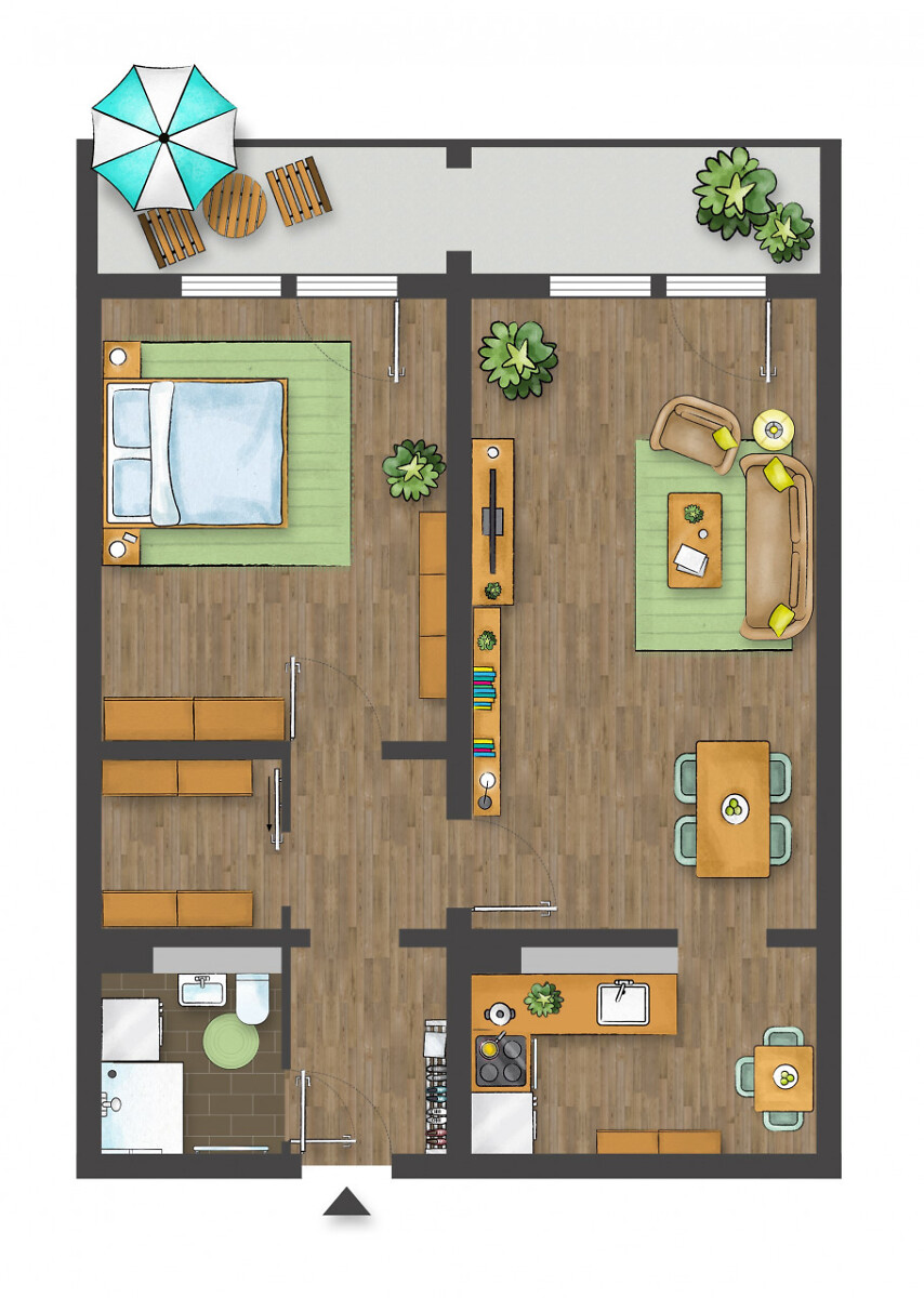 Mit dieser modernen Grundrisslösung konnten wir bereits einige Mieter des Hauses begeistern. Nun können wir erneut diese schöne 2 Raum Wohnung für Sie umbauen.
